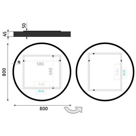 Pro dosažení kvalitního a rovnoměrného podsvícení je použit akrylový difuzor, který zajišťuje měkký a harmonický rozptyl světla bez viditelných bodových zdrojů. LED diody jsou vkusně integrovány do rámu spolu s difuzorem, což přispívá k elegantnímu a čistému vzhledu zrcadla.